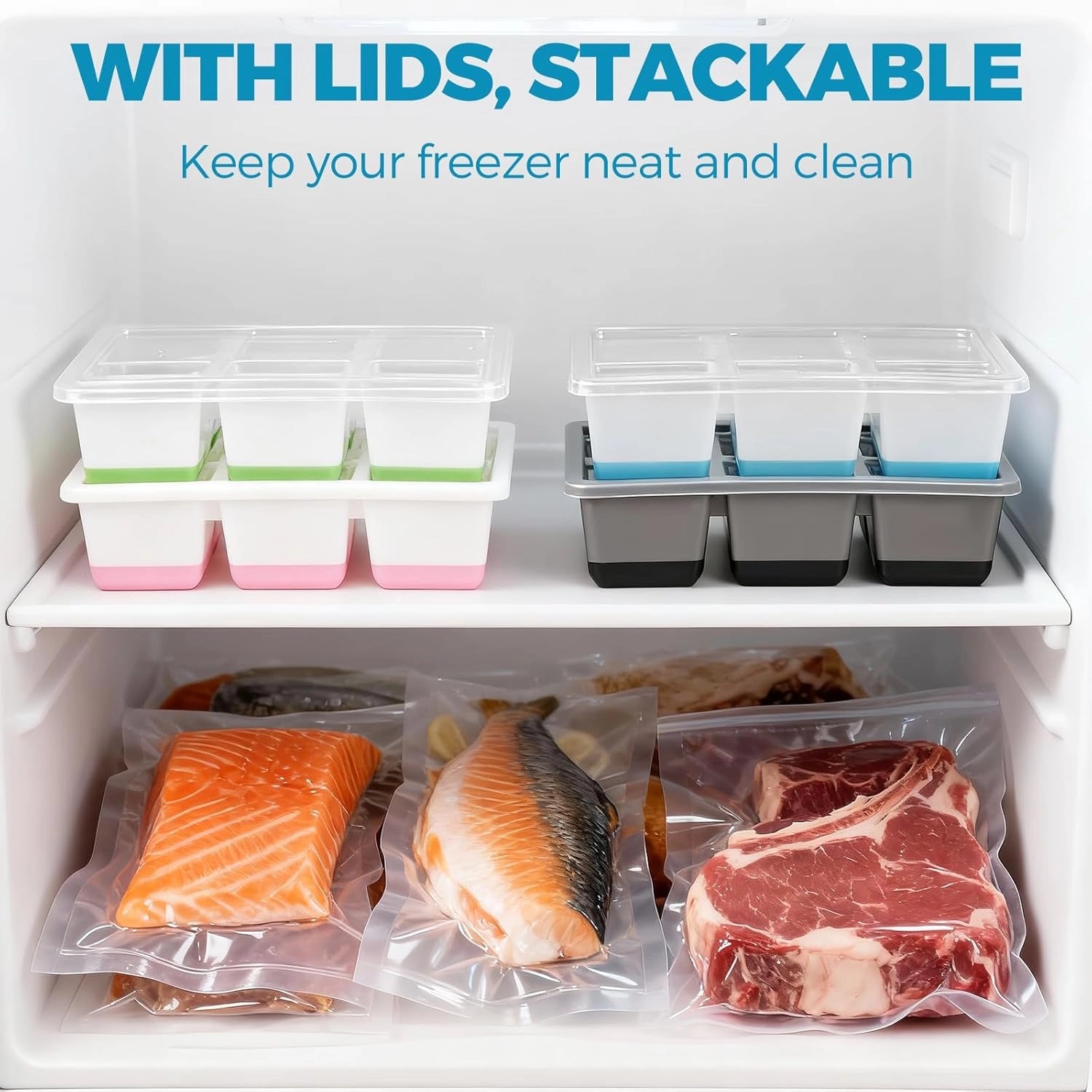 LEAKPROOF LID & STACKABLE DESIGN: The included transparent lid seals tightly to prevent spills in your freezer and blocks food odors. This ice cube tray with lid stacks easily, maximizing freezer space while ensuring fresh, pure ice every time